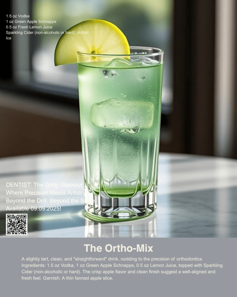 Behold The Ortho-Mix Cocktail, a liquid symphony of precision and refreshing clarity. Crafted with the meticulous balance of an expert aligner, this drink is a testament to crisp, clean execution. It opens with a bright, invigorating burst of vibrant green apple, flawlessly tempered by the zesty precision of fresh lemon, creating a perfectly calibrated tartness. The effervescent whisper of sparkling cider elevates the experience, leading to a sublimely clean, straightforward finish that leaves the palate feeling refreshed and perfectly aligned, much like the satisfying result of expert orthodontic care. Subtly sophisticated yet refreshingly direct, The Ortho-Mix is the definitive pour for those who appreciate design, diligence, and delectable taste.