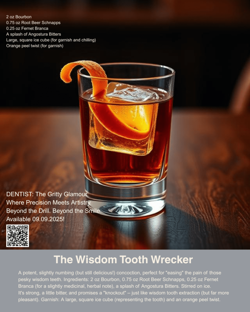 Served over a singular, monolithic ice cube, a gleaming “tooth” anchoring your experience to sweet relief, and crowned with an ethereal orange peel twist, this concoction is the ultimate bitter-sweet escape, promising a delightful “extraction” from your day’s demands into a world of potent, delicious tranquility.